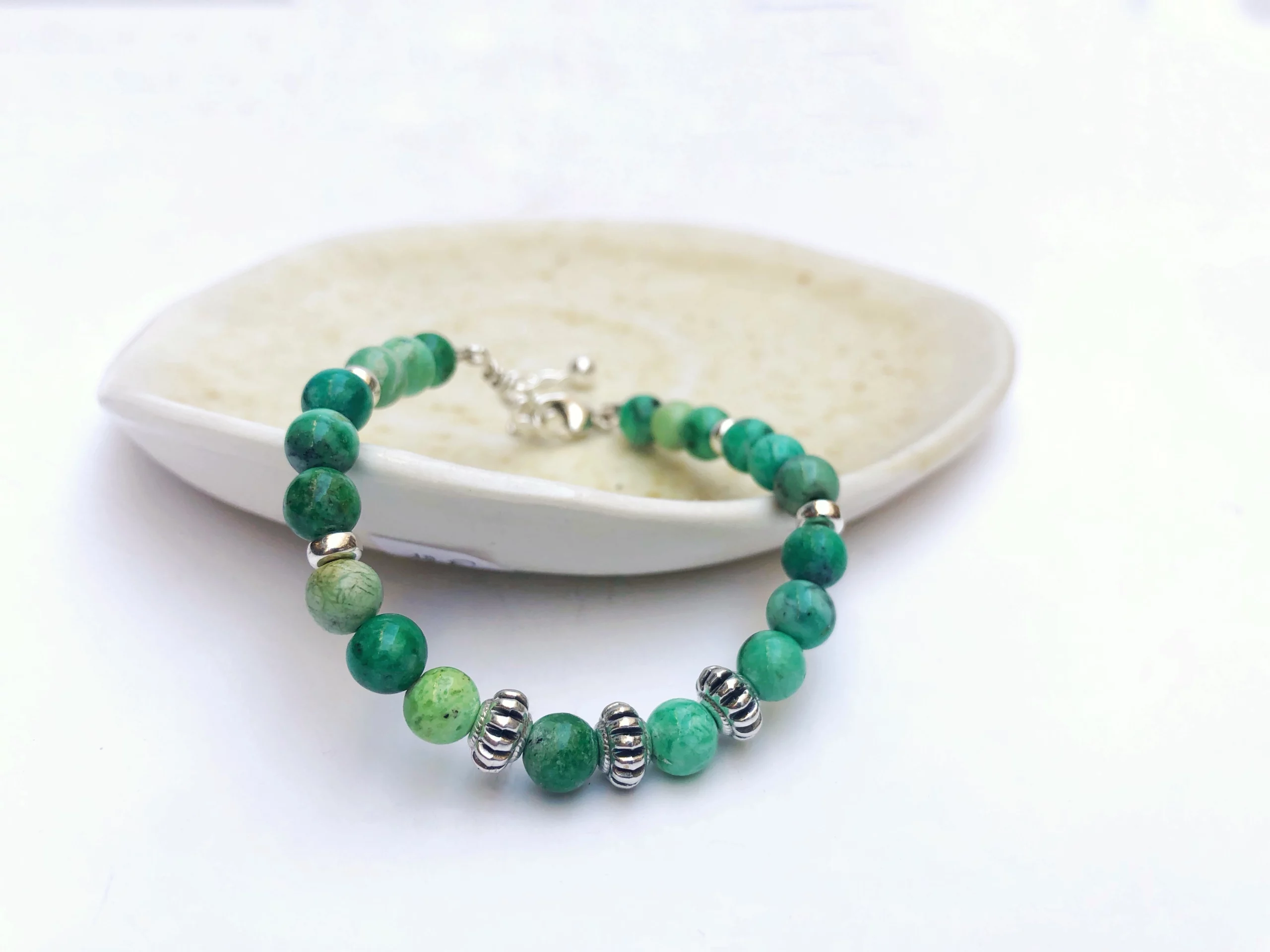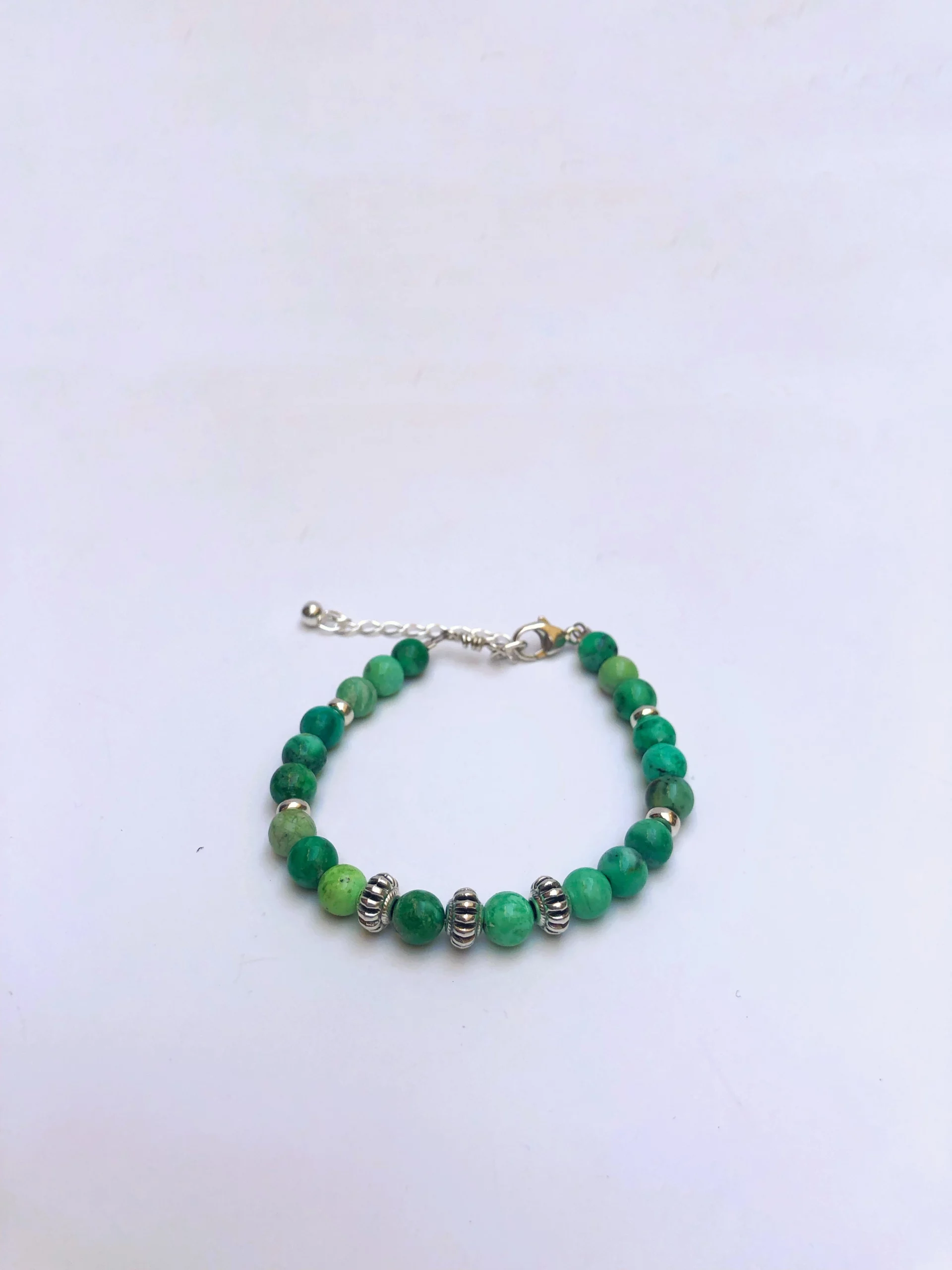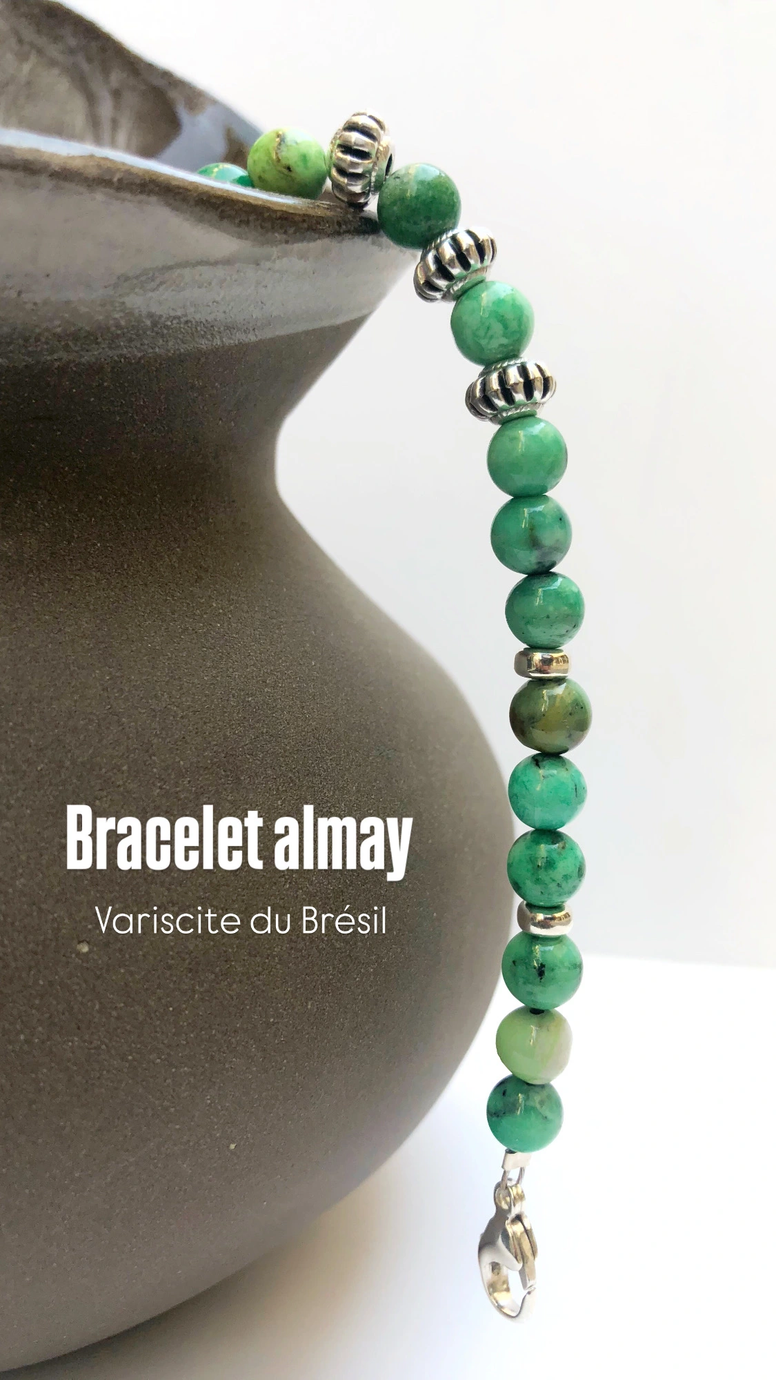 Ce bracelet lumineux est une pièce unique, réalisée entièrement à la main dans mon atelier à Bordeaux. Il est composé de pierres naturelles de variscite du Brésil, associées à des perles en argent 925, pour un rendu à la fois raffiné et authentique. Ce bijou au style ethnique et bohème chic apporte une touche d’élégance discrète à toutes vos tenues.
